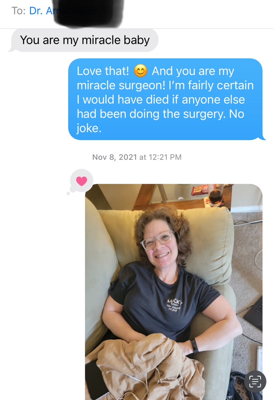 I did not know going in that I might need a miracle doc, but I listened closely to the options in front of me and chose well. And as you can see in the photo above, my doc called me his miracle baby (even though he’s five years younger than me) and told me that “someone must have been looking out for you.”